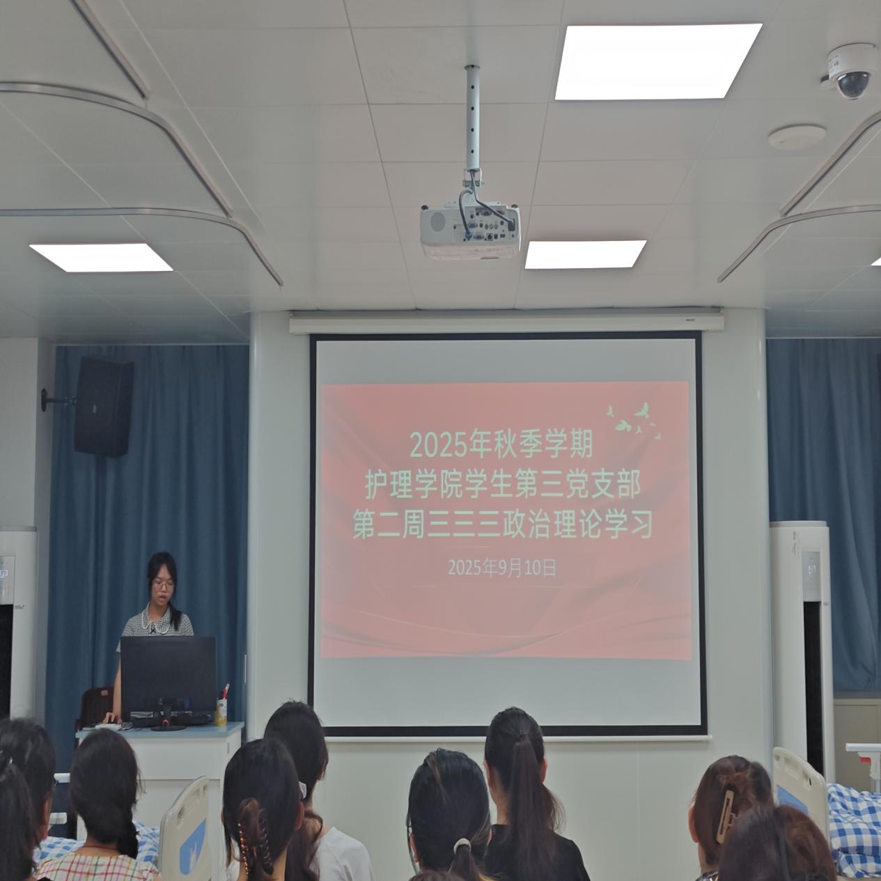 2025年9月9日下午,护理学院学生第二党支部与第三党支部在护理学院305教室联合开展“三三三”政治理论学习。会议由学生党员韦玉涵主持,两个党支部的全体在校生党员参加学习活动。