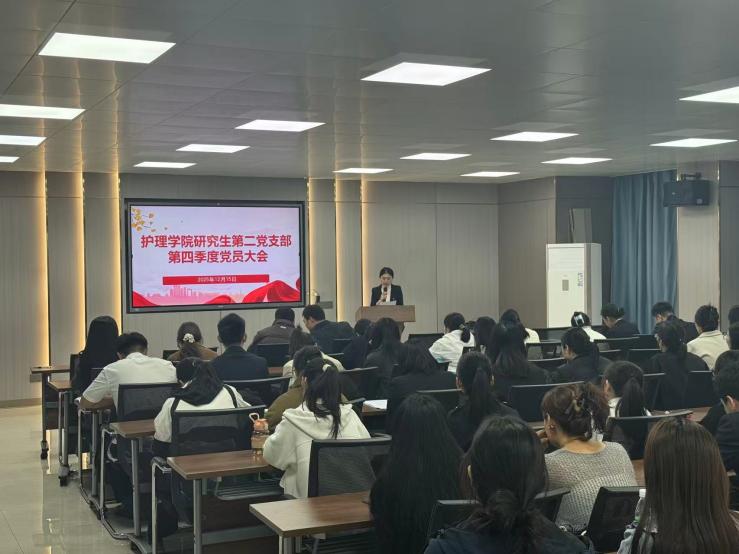 2025年12月15日晚18时,护理学院研究生第二党支部在护理学院211教室顺利召开了第四季度党员大会。会议由党支部书记纪龙飞主持,党支部的全体正式党员、预备党员参会,发展对象及部分入党积极分子列席旁听。