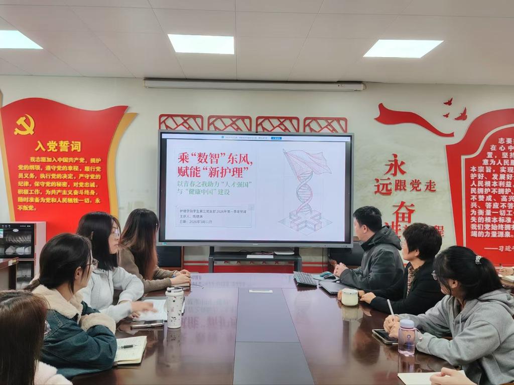 为深入学习贯彻党的创新理论和党的二十届四中全会精神,落实中央八项规定精神,筑牢思想根基,护理学院学生第三党支部于2026年3月11日在学院3楼党员活动室召开2025年度组织生活会和开展民主评议党员,并同步开展党支部2026年第一季度党课学习。护理学院党委副书记、院长张莉芳出席指导,党支部书记陈璟涛主持会议,党支部全体在校党员参会。