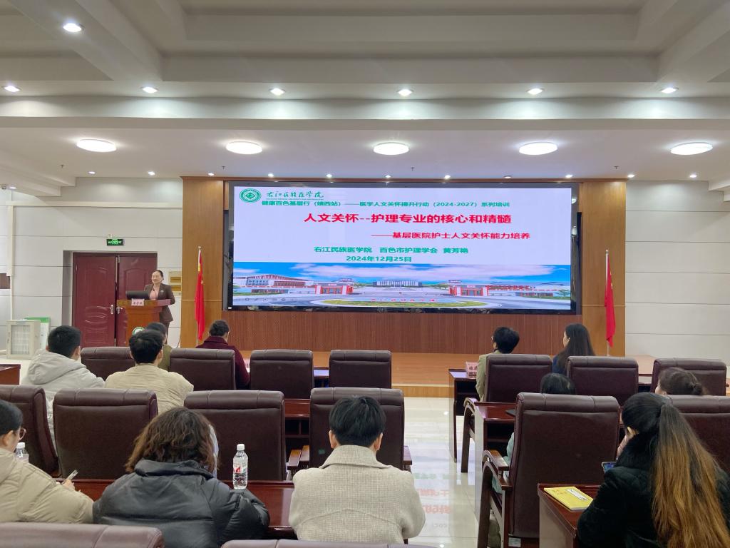 最后,在靖西市人民医院报告厅,黄芳艳教授围绕“人文关怀”护理专业的核心和精髓--基层医院护士人文关怀能力培养,从理论到实践,系统讲解了人文关怀在护理工作中的重要性,深入剖析了当前基层医院护士在人文关怀能力方面的不足与挑战。