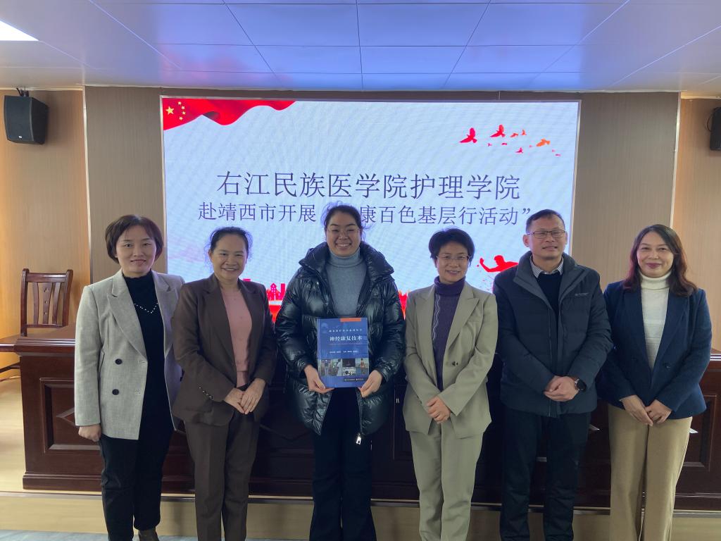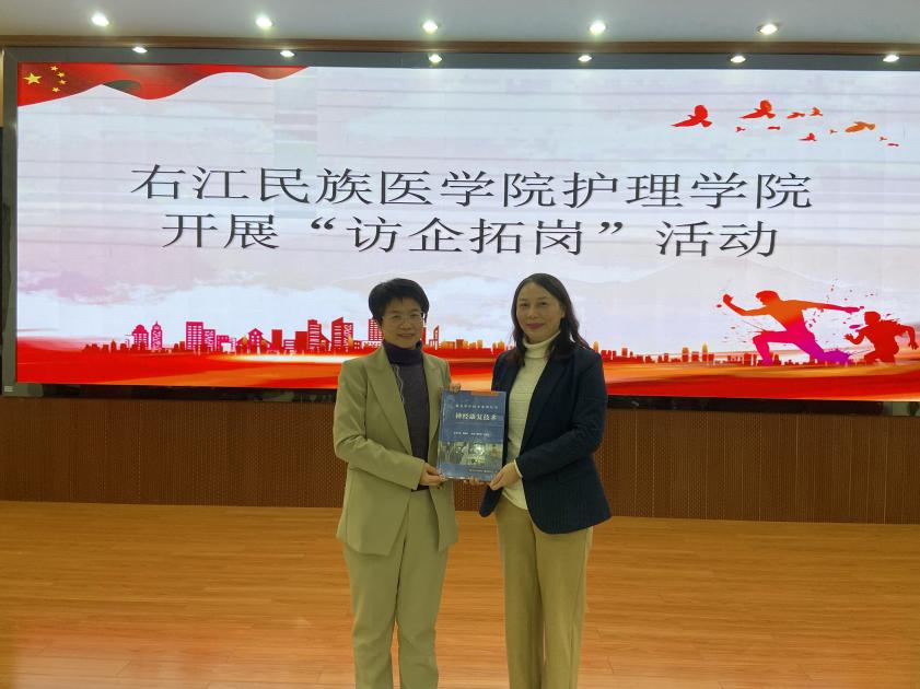 此次靖西站“访企拓岗”工作最后环节是赠书仪式,护理学院为参与单位的代表们赠送了“神经康复技术”系列丛书,表达对他们支持与合作的感谢。未来,护理学院将继续加强与基层医疗机构的合作,扩宽护理毕业生就业渠道,为区域医疗事业发展贡献力量。(图、文/护理学院 一审/麦伊 二审/钟敏锐 三审/张莉芳)