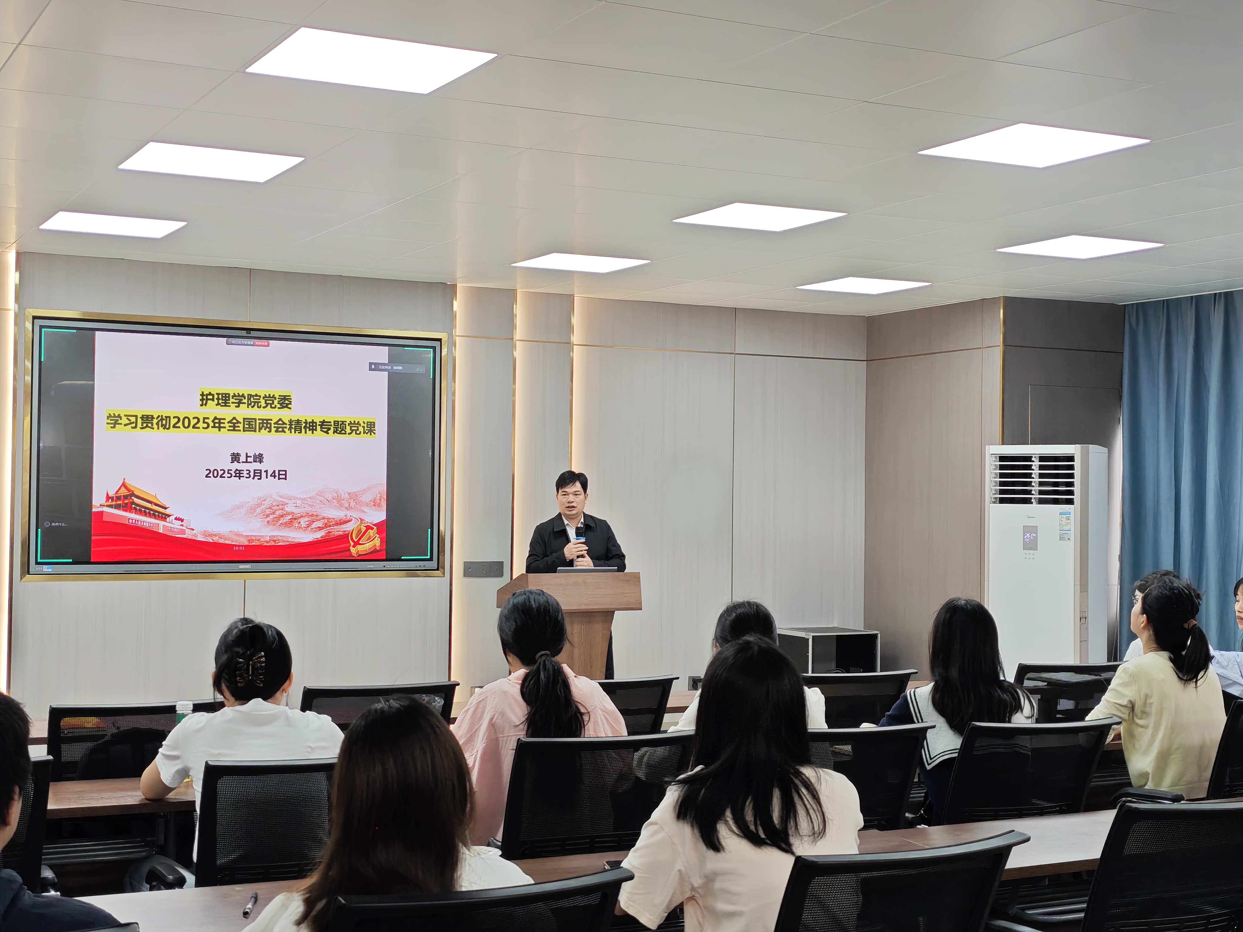 2025年3月14日,护理学院党委书记黄上峰老师为护理学院研究生第二党支部的全体党员讲授“学习贯彻2025年全国两会精神”的专题党课。此次党课旨在深入学习贯彻2025年全国两会精神,激励护理研究生将个人成长与国家发展大局紧密结合,为实现健康中国战略贡献青春力量。