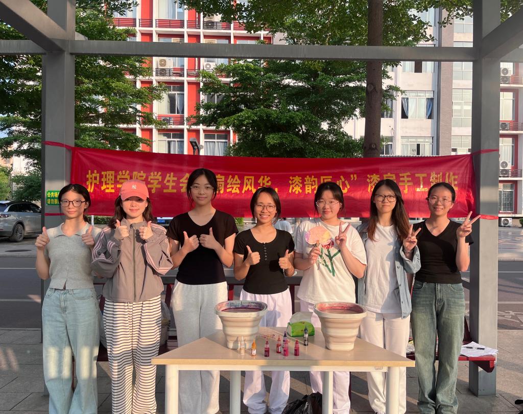 为深植中华优秀传统文化沃土,推动“三精育人”工程创新发展,2025年4月24日至25日下午,护理学院学生会在知新广场及百东校区食堂门口举办了“扇绘风华,漆韵匠心”漆扇手工制作活动。护理学院近200名同学参与此次活动,共同在实践中感受漆艺魅力。