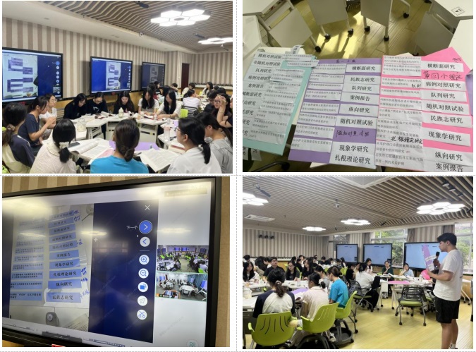 课堂活动采用“课前线上自学+课中科研设计类型分类游戏+汇报答疑”的趣味化教学流程。课前两校学生共享线上资源备课;课中由海南医科大学护理学院夏杰琼教授与右江民族医学院护理学院吕辉教授共同主导,设置两个特色游戏环节:第一轮为科研设计类型分类游戏,各小组学生领取纸条按照科研设计类型分类后制成图表上传,老师通过雨课堂随机抽取了海南医科大学其中一个小组的学生代表汇报,其他组补充;第二轮为科研设计应用游戏,学生为研究问题匹配合适的研究设计并制成图表上传,老师通过雨课堂随机抽取了右江民族医学院其中一个小组的学生代表进行汇报,其他组分享不同观点。