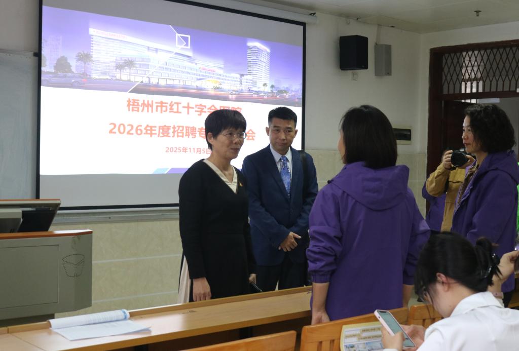 贝康国际和梧州市红十字会医院两家单位的专场宣讲会,系统地介绍了医院概况、岗位需求、薪酬待遇及职业发展路径。贝康国际专场由经理谢耀杨进行宣讲并答疑;广西中医药大学附属医院专场中,护理学院党委副书记邱勇强到会场了解面试进展并对毕业生进行指导;梧州市红十字会医院专场中,护理学院副院长麻新灵到场迎接面试官并协调组织面试工作,学校党委副书记赵丽娟到会场与用人单位负责人交流,详细询问用人单位的招聘需求以及对学校人才培养工作的意见建议,并对用人单位一直以来对学校就业工作的大力支持表示衷心感谢。