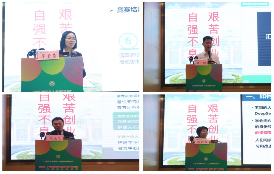 专题讲座环节分别由百色市人民医院护理部副主任覃丽锦主任护师、德保县妇幼保健院王艳芽主任护师以及护理学院外科护理学教研室副主任朱旺乔博士主持。安力彬教授、黄芳艳教授、黄秋环教授、尹毅霞教授、覃莹莹副主任护师、吕辉教授、纪龙飞博士、张莉芳教授分别主讲《临床思维能力的培养策略》、《叙事护理与关爱沟通:提升护理服务的温度与深度》、《临床护理创新用具专利申报及转化策略》、《实践教学“两性一度”教学策略》、《基于技能竞赛的临床思维与学生核心能力培养》、《AI 赋能的临床教学实践策略与前沿探索》、《护理实践中的质性研究——从哲学范式视角出发》、《临床教学管理中实用线上平台及高效管理策略》等专题。在临床护理实践操作环节,天津医科大学护理学院副院长林梅教授则通过具体病例,点评了规范化教学查房的设计逻辑与实施要点。讲座期间学员们积极互动,现场气氛热烈。学员们纷纷表示,课程既有理论高度,又贴近实际工作,为解决实际工作难题提供了新思路。