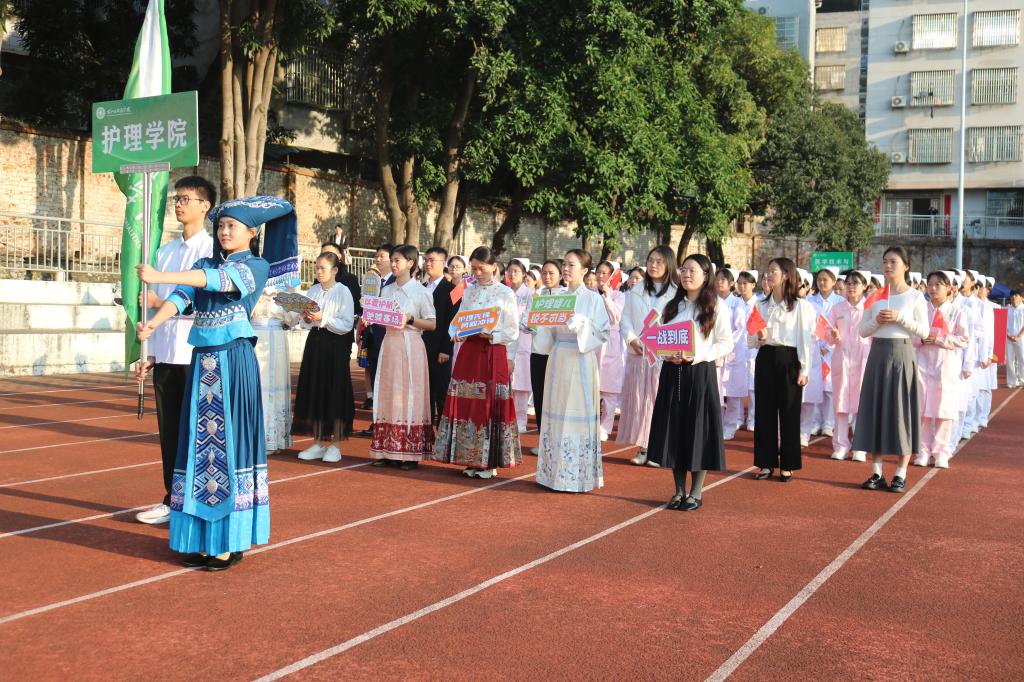 伴随着国旗护卫队铿锵有力、整齐划一的步伐,五星红旗与各院院徽依次入场,拉开入场式的序幕。护理学院方队随之而来,身着壮乡服饰的举牌手率先引路,身后的教师与学子队列整齐、精神抖擞,行进间齐声喊出嘹亮的口号,尽显护理学子的昂扬斗志。队伍停驻时,民族表演者翩翩起舞,五彩壮锦上的花鸟纹样精美生动,让壮族特色在赛场中熠熠生辉。
