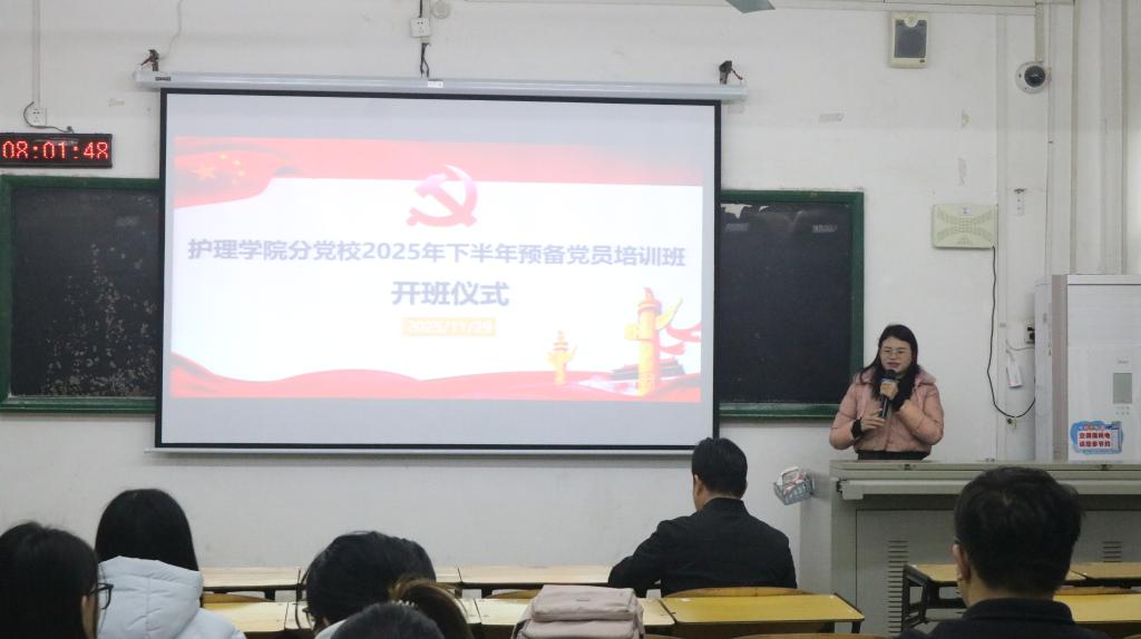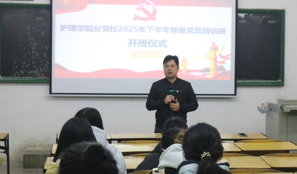 为进一步提升预备党员的政治理论素养、党性修养和宗旨意识,确保学生党员发展质量,11月29日,护理学院在4-202教室举办2025年第2期(下半年)预备党员培训班开班仪式暨第一讲。护理学院党委书记黄上峰出席本次开班仪式,护理学院党委组织员钟晓燕老师主持仪式,护理学院全体预备党员参加学习。