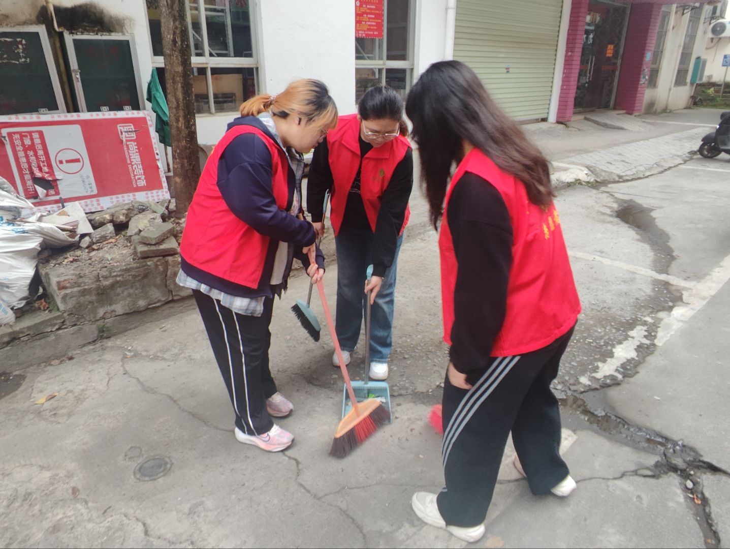 与此同时,负责社区环境优化的同学们手持扫帚,簸箕等清洁工具,干劲十足地投入到环境整治工作中,重点清理草丛、路面和卫生死角中的垃圾杂物。劳动中,同学们以青春行动践行志愿服务精神,用青春之力为国家基层治理现代化、生态文明建设添砖加瓦。
