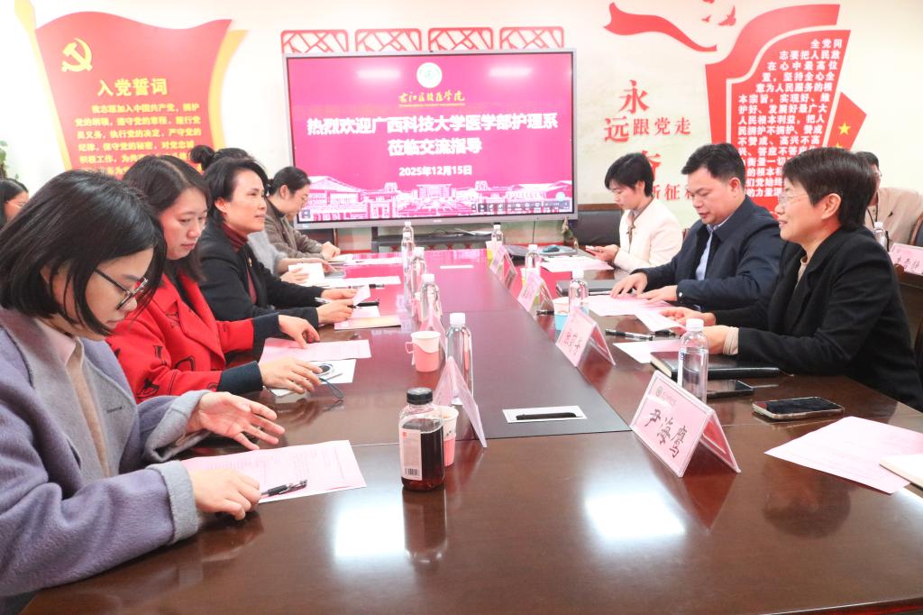 12月15日下午,广西科技大学医学部护理系党总支书记、护理学专业负责人覃启鲜带队一行8人到我校护理学院开展交流,双方围绕护理学专业认证、专业建设与教学管理等核心议题展开深入交流。