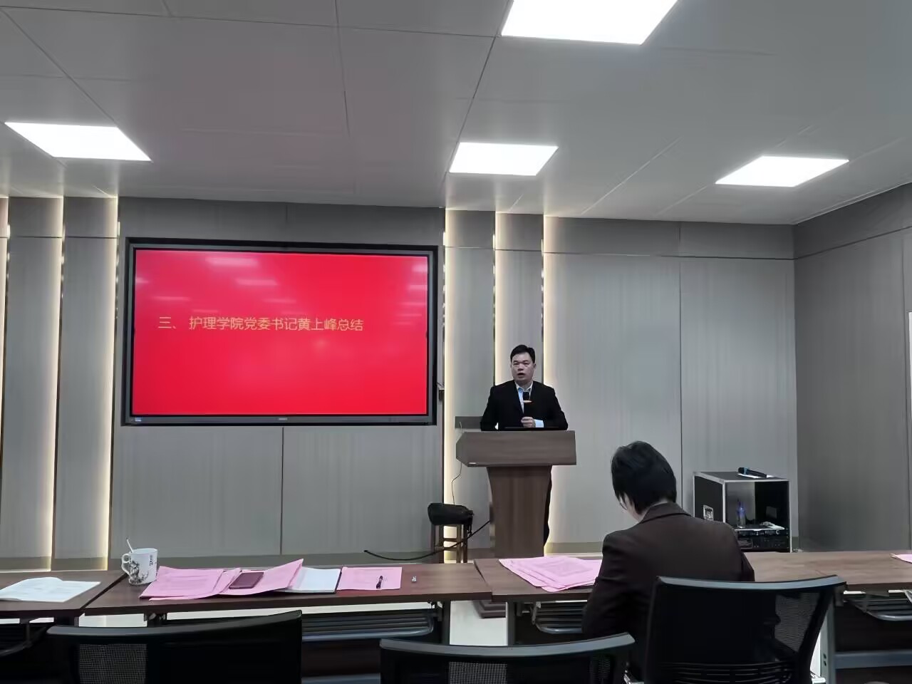 护理学院党委书记黄上峰对现场述职的党支部一一进行了点评并提出具体工作建议。黄上峰书记首先肯定了学院各党支部在推动政治理论学习、党建与业务深度融合、落实“三会一课”制度、强化党员教育管理等方面取得的成效,同时指出理论学习与专业结合不深、党建品牌凝练不足、支部联动机制不健全等共性问题,并提出具体工作建议。